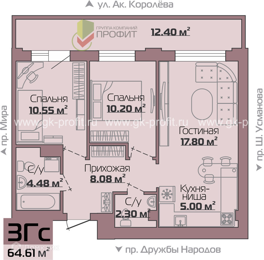 - Общая площадь: 63.9 м²