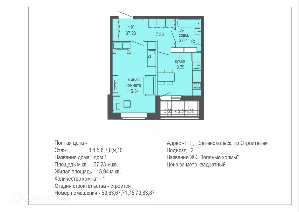 Планировка 1 комн. в ЖК "Зеленые Холмы"