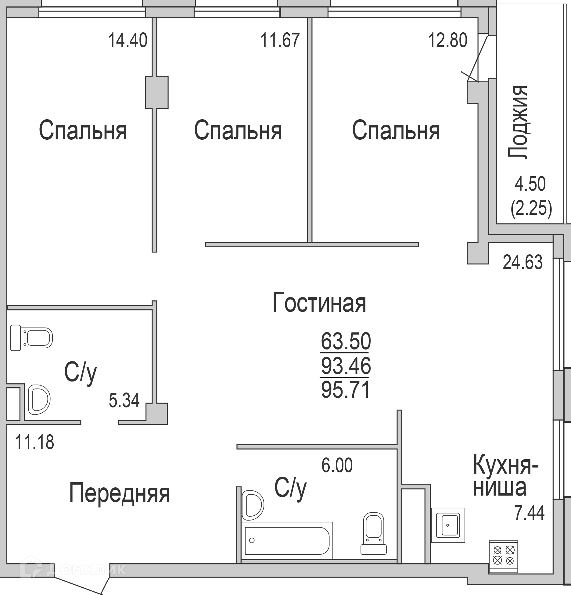Планировка 3 комн. в ЖК "НА САРМАНОВСКОМ"