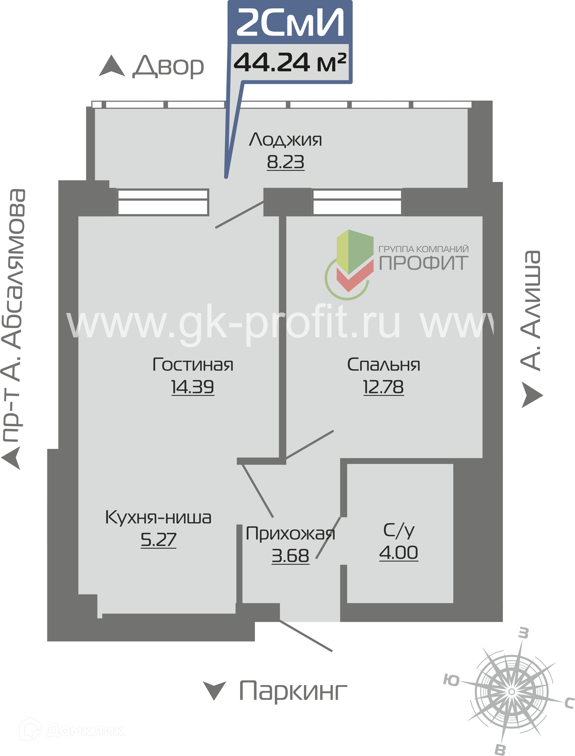 - Общая площадь: 44.24 м²