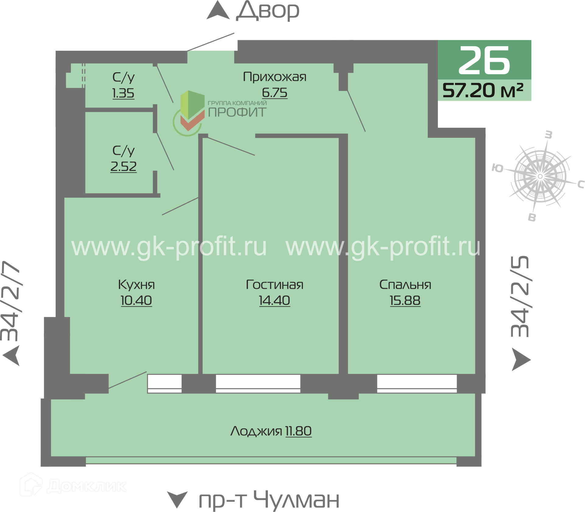 - Общая площадь: 57.2 м²