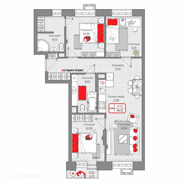 4 комн. квартира в Казане в ипотеку от 106 214 руб/месяц