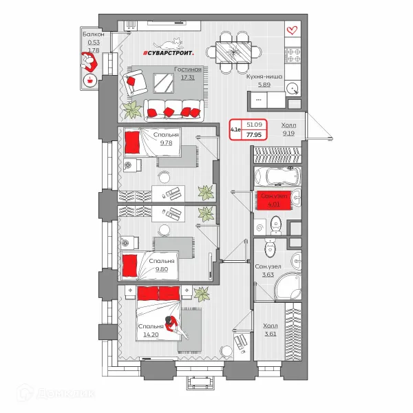 4 комн. квартира в Казане в ипотеку от 94 916 руб/месяц