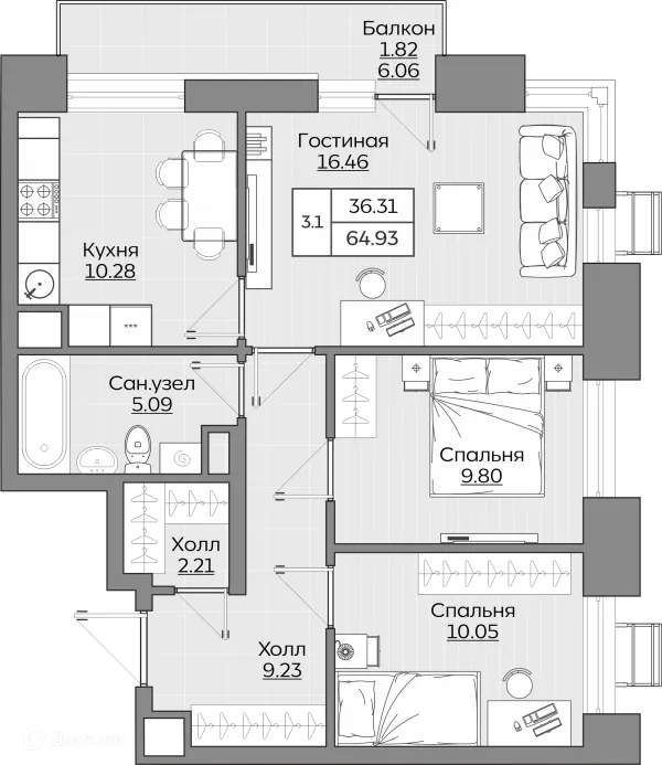 3 комн. квартира в Казане в ипотеку от 206 023 руб/месяц