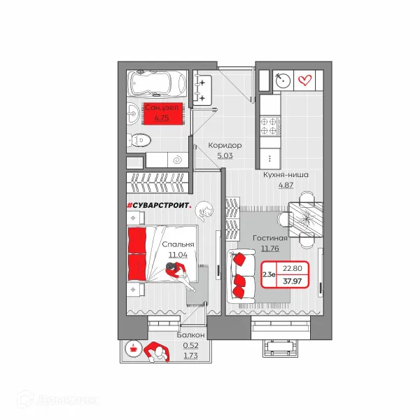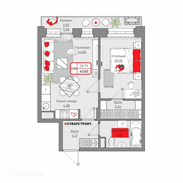 2 комн. квартира в Казане в ипотеку от 63 023 руб/месяц