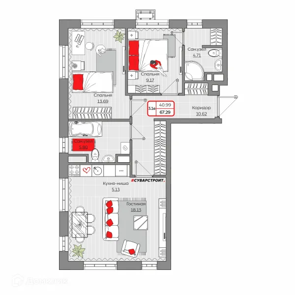 3 комн. квартира в Казане в ипотеку от 206 023 руб/месяц