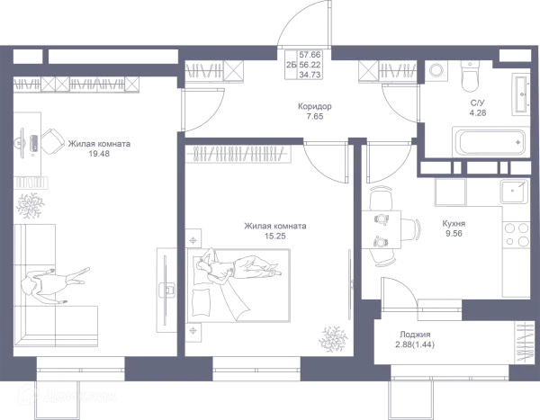 2 комн. квартира в Казане в ипотеку от 75 557 руб/месяц