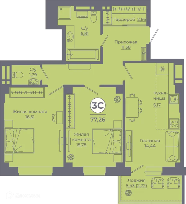 3 комн. квартира в Ростове-на-Дону в ипотеку от 75 595 руб/месяц