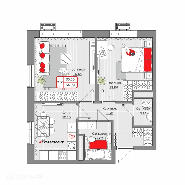 2 комн. квартира в Казане в ипотеку от 64 110 руб/месяц