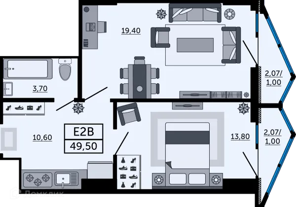 2 комн. квартира в Ростове-на-Дону в ипотеку от 51 789 руб/месяц