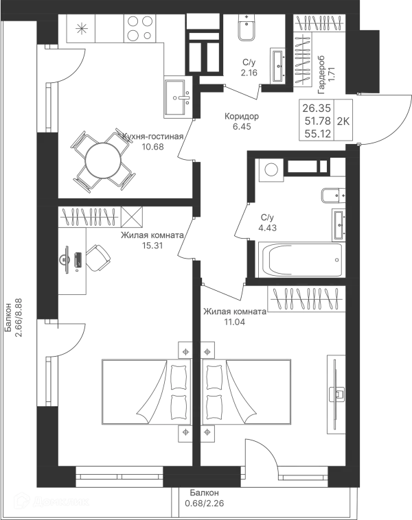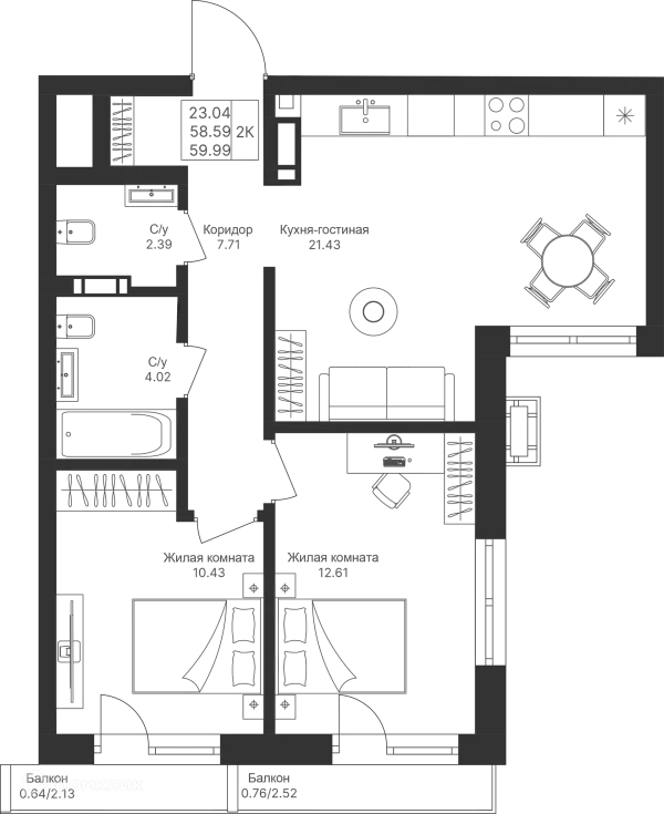 2 комн. квартира в Казане в ипотеку от 104 256 руб/месяц