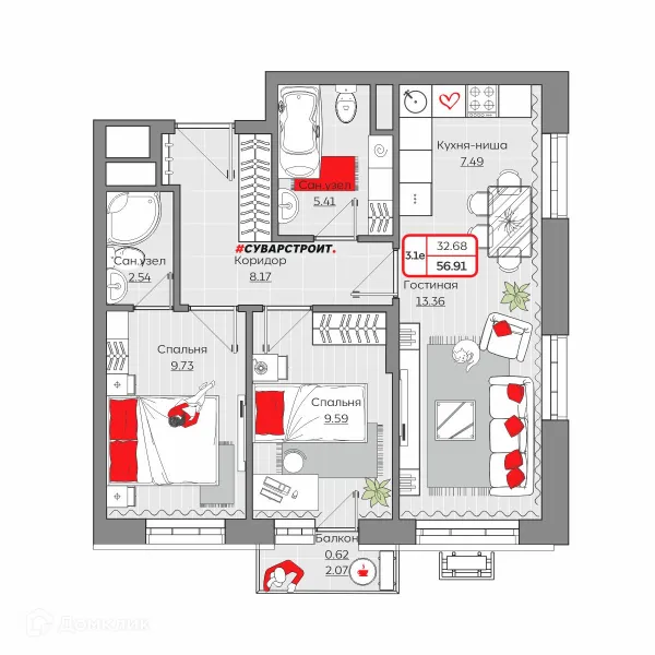 3 комн. квартира в Казане в ипотеку от 98 128 руб/месяц