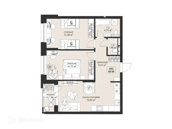 2 комн. квартира в Казане в ипотеку от 203 112 руб/месяц