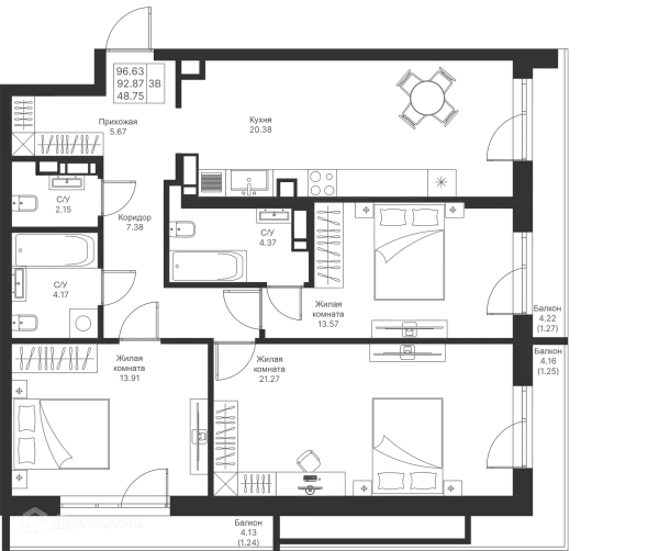 3 комн. квартира в Казане в ипотеку от 142 017 руб/месяц