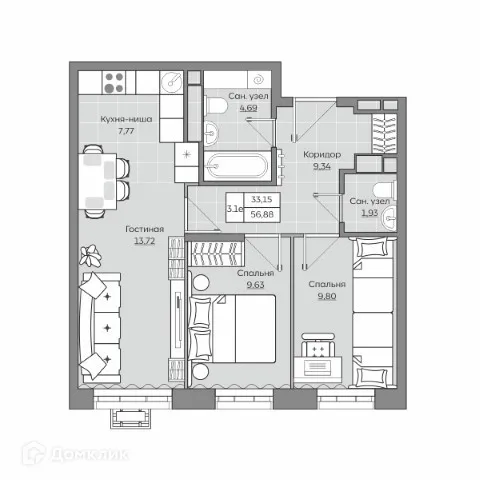 3 комн. квартира в Казане в ипотеку от 101 605 руб/месяц