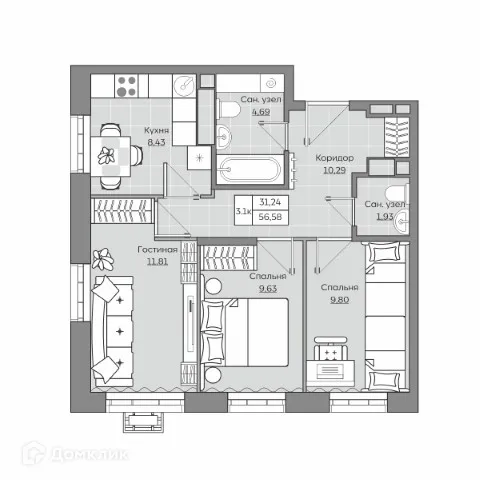 3 комн. квартира в Казане в ипотеку от 96 587 руб/месяц