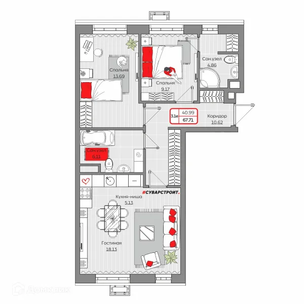 3 комн. квартира в Казане в ипотеку от 83 711 руб/месяц