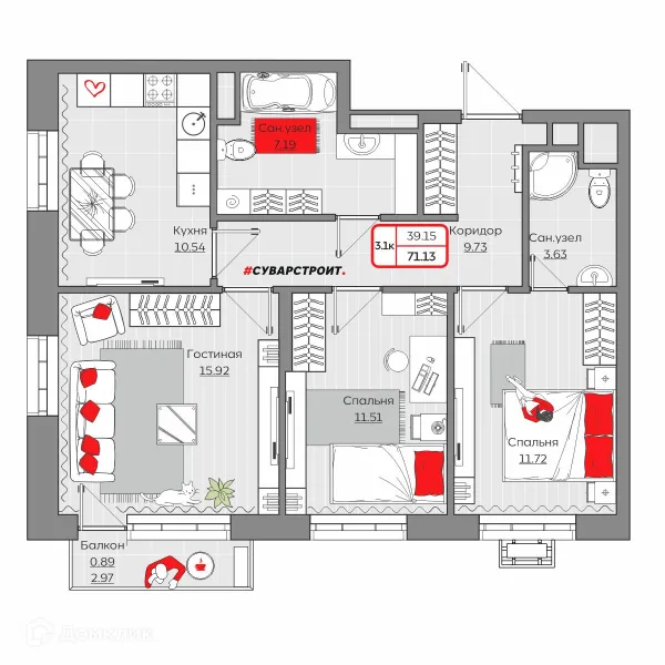 3 комн. квартира в Казане в ипотеку от 98 502 руб/месяц