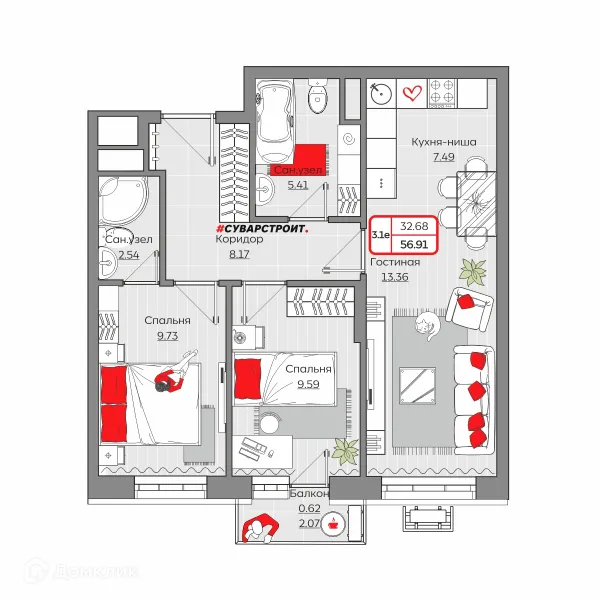 3 комн. квартира в Казане в ипотеку от 308 375 руб/месяц