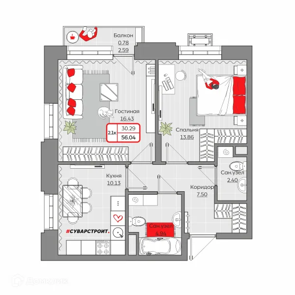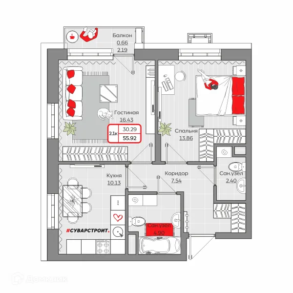 2 комн. квартира в Казане в ипотеку от 79 808 руб/месяц