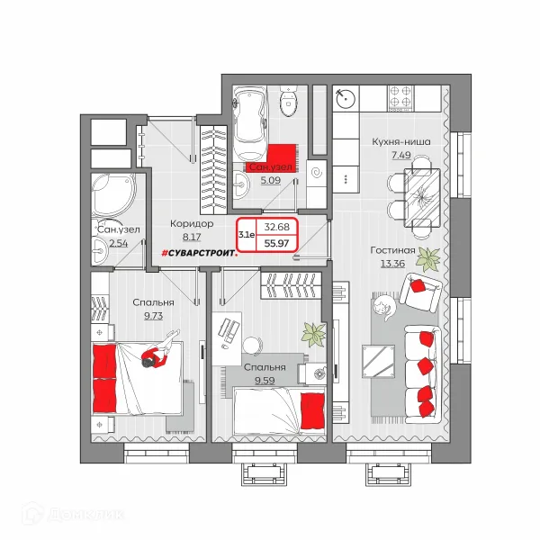 3 комн. квартира в Казане в ипотеку от 97 825 руб/месяц