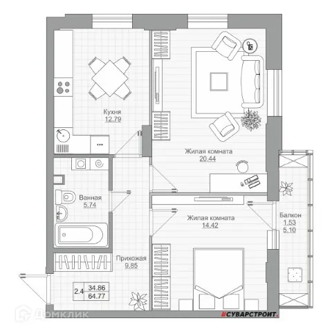 2 комн. квартира в Казане в ипотеку от 64 672 руб/месяц